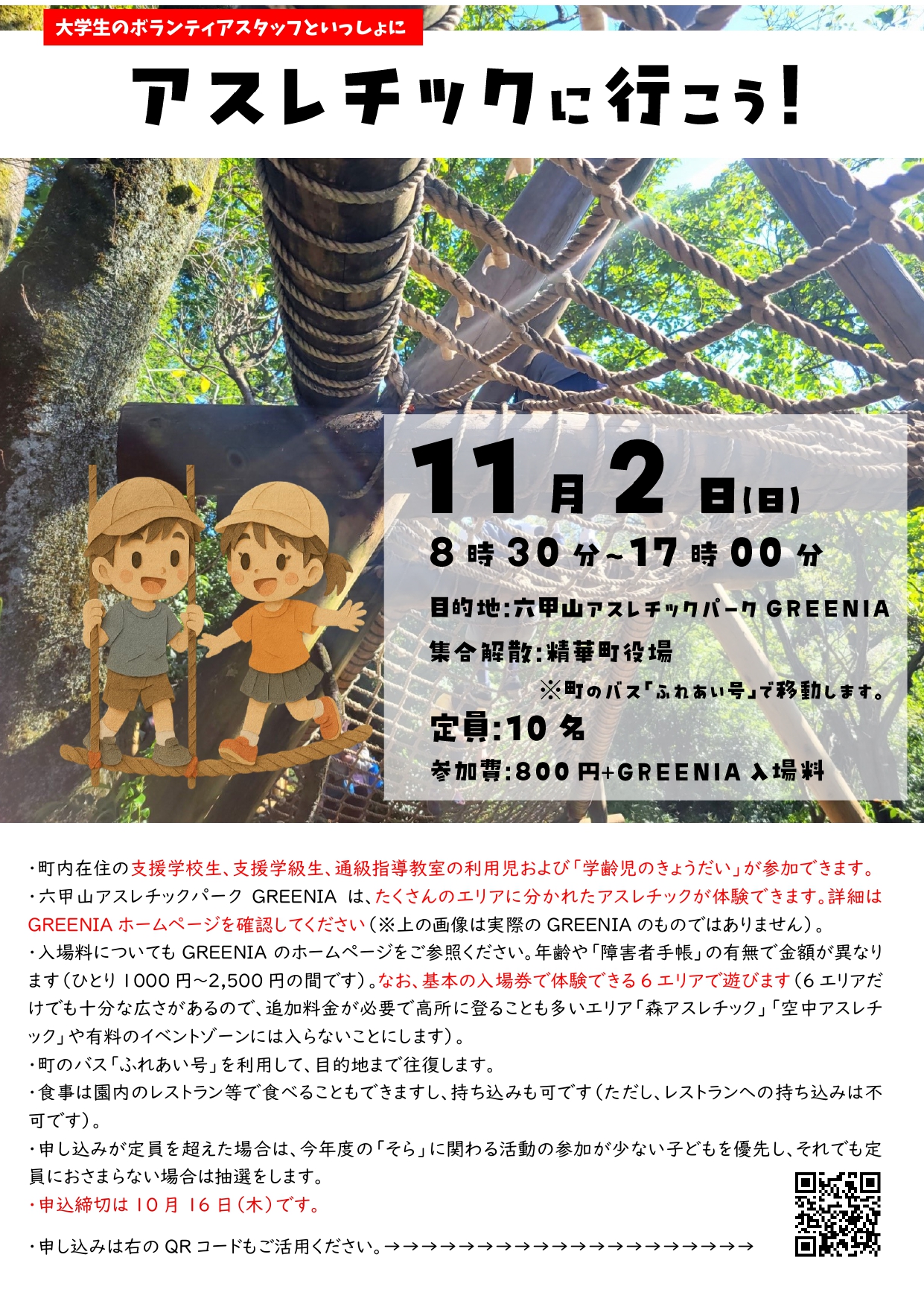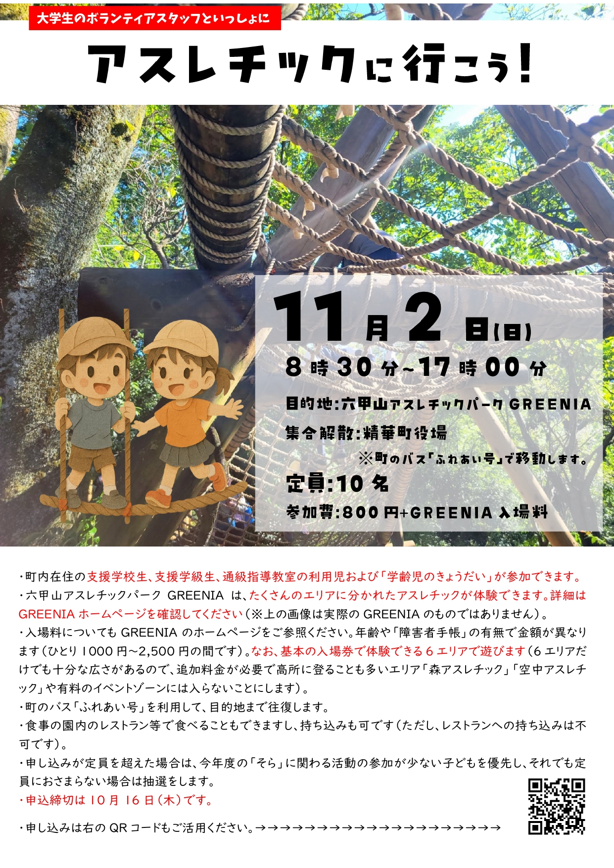 今年は、神戸・六甲山にある『六甲山アスレチックパーク GREENIA』に行きます。屋外アスレチック施設としては、日本最大なのだそうです。入場券で利用できる6エリアで遊ぼうと思います。目的地までの往復は精華町のバス「ふれあい号」を利用させていただきます。