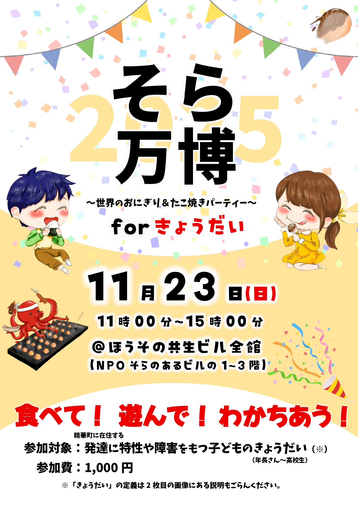 内容:世界のおにぎり&たこ焼きパーティー、世界のおもちゃ・ゲーム遊び、きょうだいどうしで遊びながら話そう、など