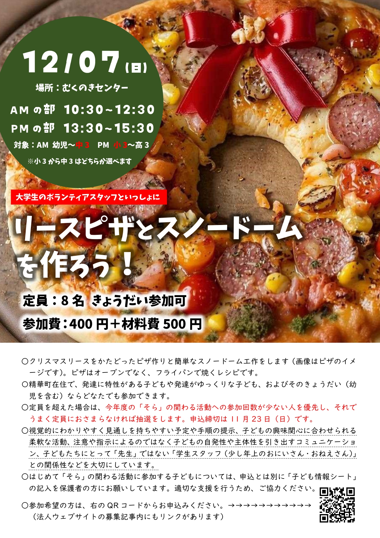 12月7日(日)に「リースピザとスノードームを作ろう!」をします。場所はむくのきセンターです。